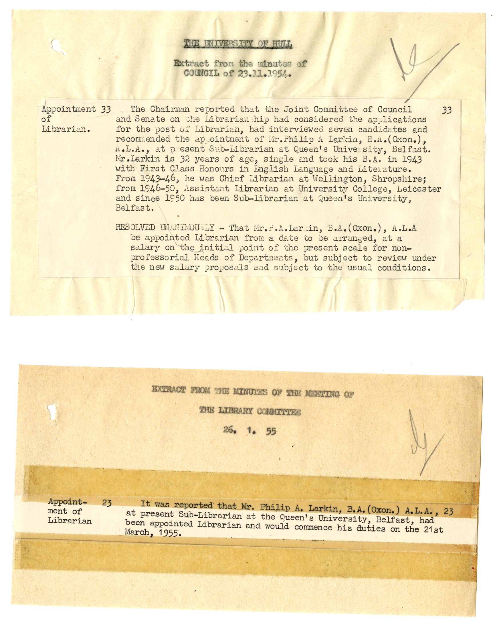 Bottom – U PHR/1/292 Extract from the Minutes of the Meeting of the Library Committee regarding start date