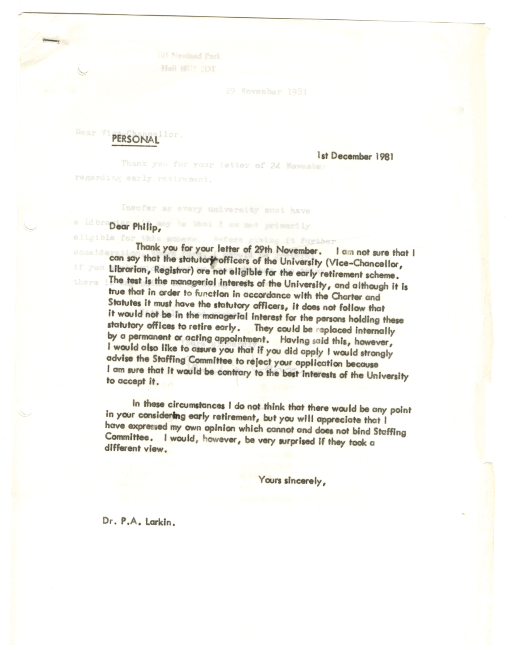 I was at Hull University from 1958 to 1967 as undergraduate through to Lecturer in the Department of Physics. My closest contact with Larkin was as a very young departmental member of the library committee. My abiding memory is of a rather small, neat man, impeccably dressed, three piece suit I recall, a quintessentially establishment figure as he chaired the committee with complete focus, formality and dominance. I thought at the time, where on earth is the poet? This guy is more like my idea of a civil servant than that of a poet. I guess this duality in his roles is reflected in the many biographical works on the man. Two decades later, then indeed as a Civil Servant I was working as a scientific advisor in Whitehall and attended more committee meetings than I care to recall. I always carried into those meetings the template of committee management instilled through those first encounters with Larkin. I have to say in those staid Whitehall meetings none seemed quite so formal as my first encounters with bureaucracy through Mr Larkin.