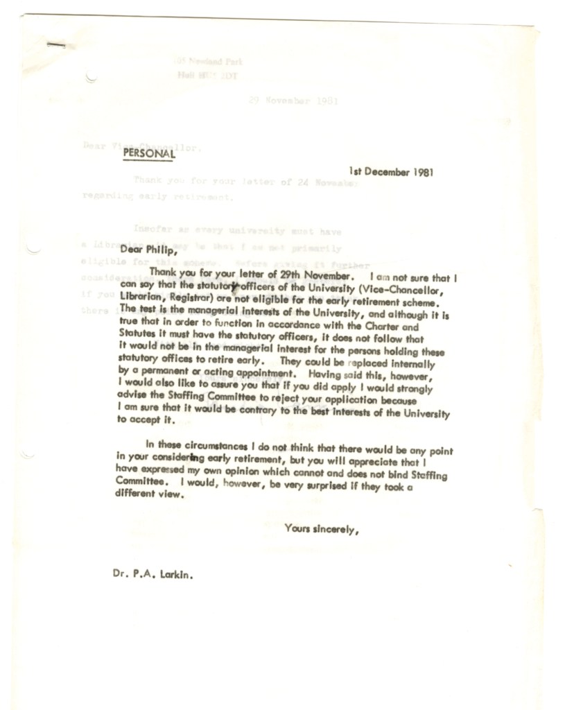 I spent many an hour in Larkin’s new library that opened soon after my arrival in Hull and saw very little of him there! Maeve Brennan was very much more to the fore with any enquiries I had. My wife of 8 months Pauline and I attended the staff dance that Maeve persuaded Philip to attend. I have no recall of seeing them at the dance which is a pity given the impact it clearly had on him. My only other direct recall is sharing the same train with him to London and seeing a wedding party on the platform in one of the stopping stations. He was travelling first class which amused me as it was foreign territory to me in those days. I was astonished to read Whitsun Weddings, and tried hard to meld my shared journey and witnessing the wedding party on the platform with his immortalised lines. Truth to say, it may well have been a different occasion that our paths crossed.