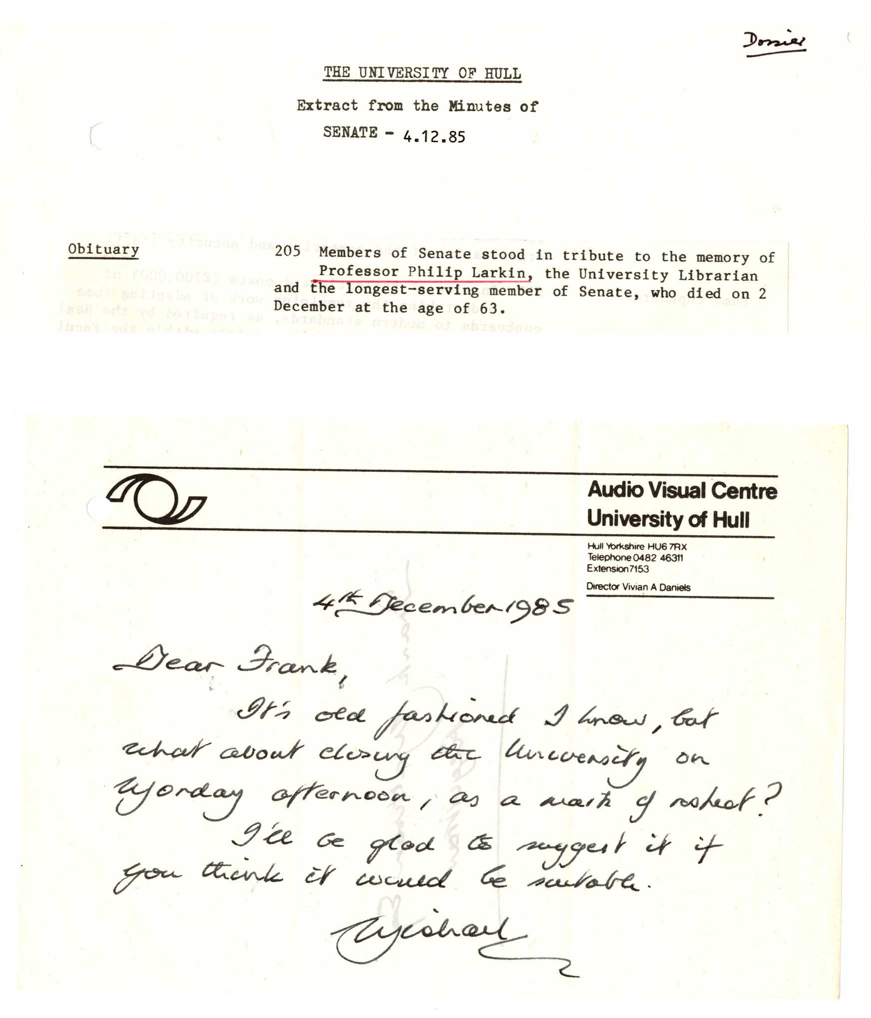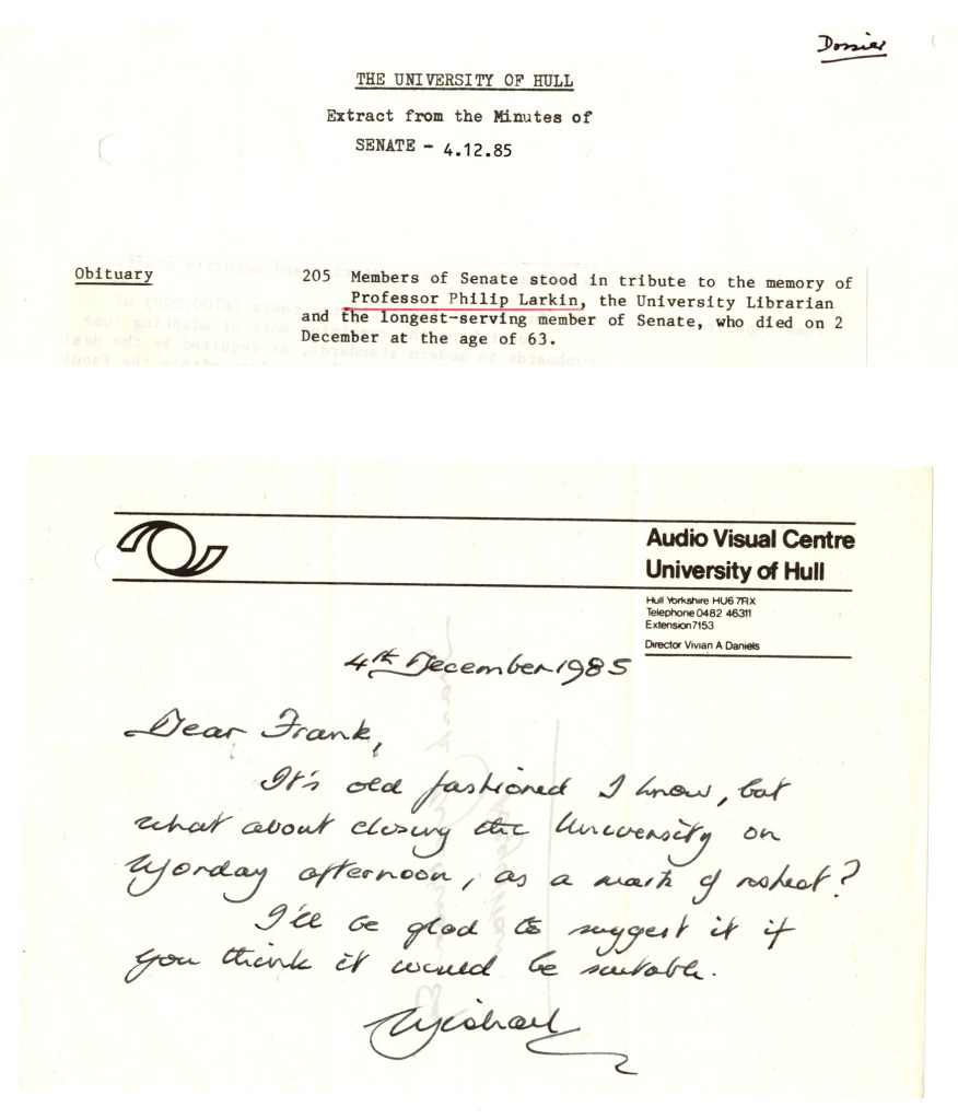 In this the third and final installment of our collected alumni memories of Philip Larkin, we share some more photographs – some of Larkin, one that features his father and was sent in by alumni Rosemary Cann, and a photograph of the best looking birthday cake I have ever seen. In addition, from the archives, we find records that bookend Larkin’s time at the University of Hull, including a touching request to close the University for the day as a mark of respect after his death.
